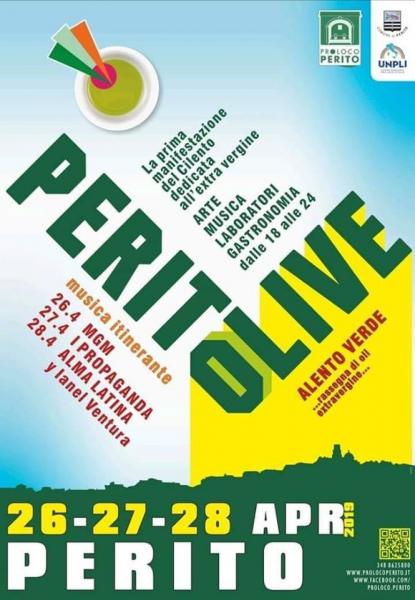 Si terrà da venerdì 26 a domenica 28 aprile 2019 la nuova edizione di PeritOlive, la manifestazione che mette in primis in risalto le peculiarità dell’olio extravergine d’oliva in aggiunta a laboratori dedicati ai bambini e agli adulti, arte cultura e tante specialità enogastronomiche.Nelle tre serate, nel centro storico di Perito saranno aperti i vecchi portoni e i locali terranei che si trasformeranno in punti di degustazione dove poter assaporare i piatti della tradizione. Le tre serate saranno allietate dalla musica dei gruppi: Propaganda, MGM 101, Alma Latina. Nel corso degli anni la manifestazione è cresciuta di livello con convegni di settore, corsi di potatura fino alla nascita di un’etichetta “Peritolive” per la promozione di campioni di olio extravergine e oli aromatizzati. Dal 2011 la manifestazione si è sempre tenuta durante le festività natalizie, dal 2018 la Pro Loco di Perito ha deciso di cambiare le date non solo per l’inclemenza del meteo constatata durante il mese di dicembre, ma tali date non sono frutto di casualità, infatti è proprio in questo periodo, quello primaverile, che l’olio giunge a completa maturazione. Motivo per cui per il secondo anno la Pro Loco con l'associazione "Oleum" presenta Alento: il primo concorso riservato ai produttori di extravergine della provincia di Salerno. Il concorso si propone lo scopo di stimolare, i produttori del nostro territorio, verso un miglioramento della qualità del prodotto e soprattutto a individuare le migliori produzioni di oli extravergini di oliva locali e di favorirne la conoscenza offrendone una vasta panoramica ai consumatori. Condizione essenziale per partecipare al concorso, è che gli oli provengano da aziende che svolgano tutte le fasi della filiera produttiva all’interno della Provincia di Salerno. Gli stand saranno attivi nei giorni della manifestazione dalle ore 18.00 alle ore 24.00.