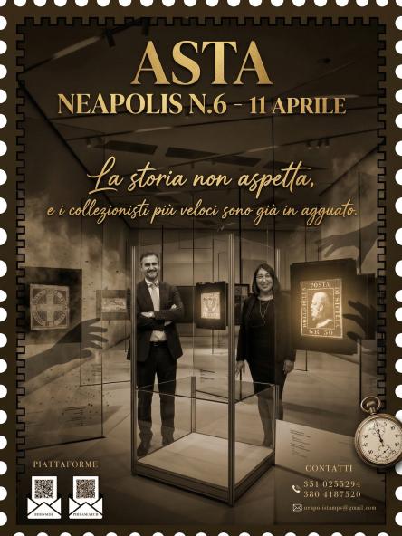 Non è un caso che il motto e il richiamo visivo della locandina ufficiale sia un'affermazione decisa: “Stamps are art”.In questa visione, il francobollo trascende la sua natura di mero oggetto da collezione per affermarsi come una vera e propria opera d'arte, minuta nelle dimensioni ma immensa nel suo portato storico e simbolico.A conferma del prestigio e del respiro internazionale dell'evento, l'Asta Neapolis n. 6 è ospitata sulle principali e più autorevoli piattaforme mondiali del settore: Bidinside e Philasearch.Un posizionamento che colloca l'iniziativa all'altezza delle aspettative di un pubblico globale altamente qualificato."Ci auguriamo che questi incontri possano risultare affascinanti per tutti.